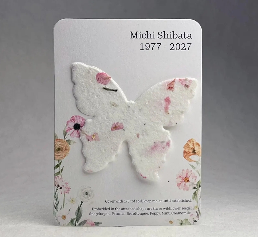 A butterfly cut from seed paper, printed with their name and the dates of their life. Plant it after the funeral, and when the wildflowers bloom — snapdragons, chamomile, mountain mint — their memory blooms with them. Some will come back year after year.
